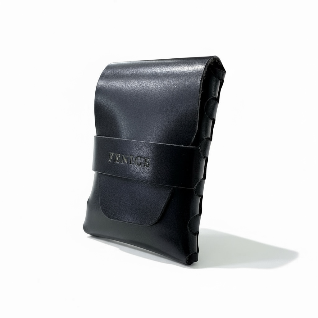 A vertical single-pocket wallet constructed through interlocking leather panels.